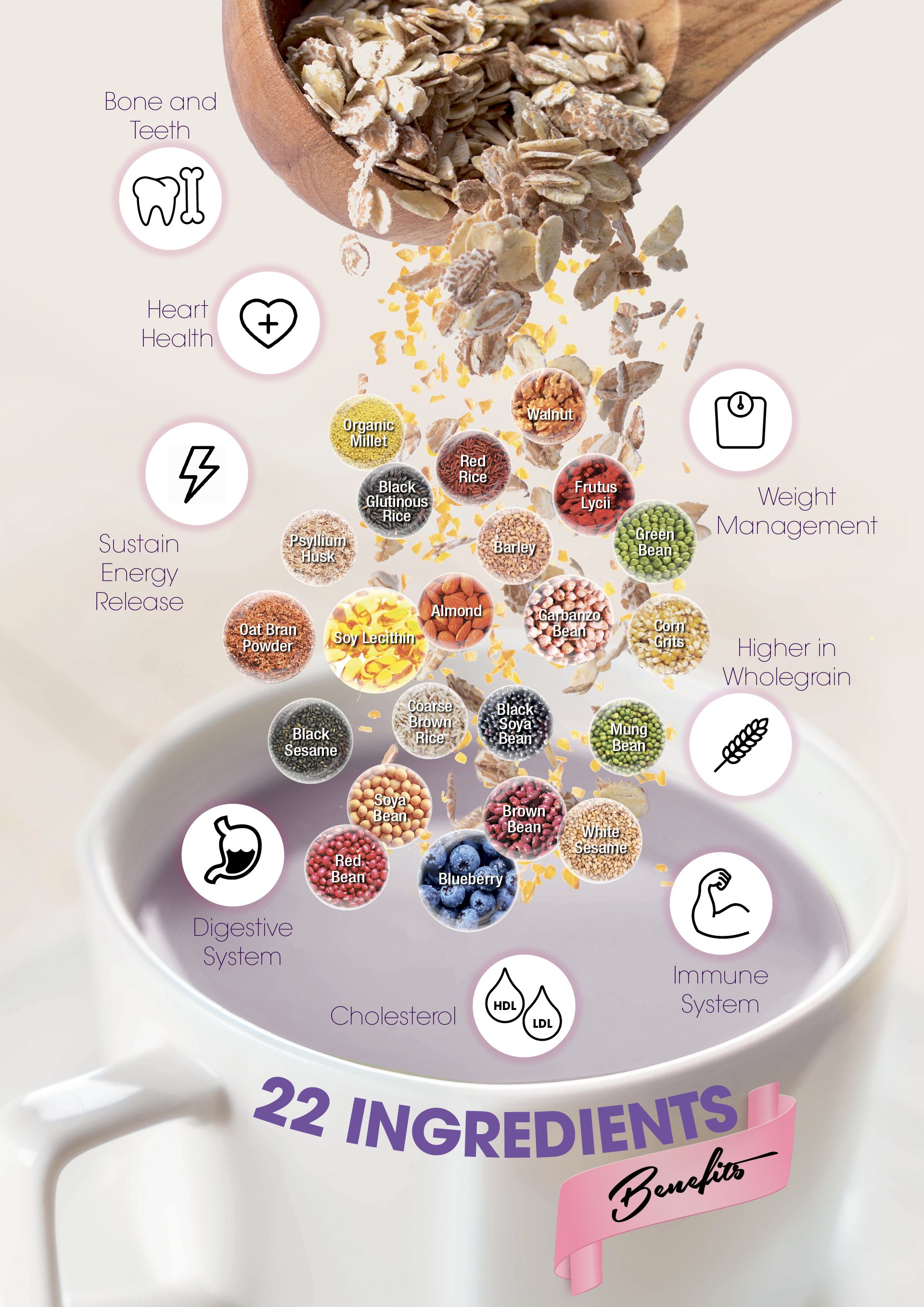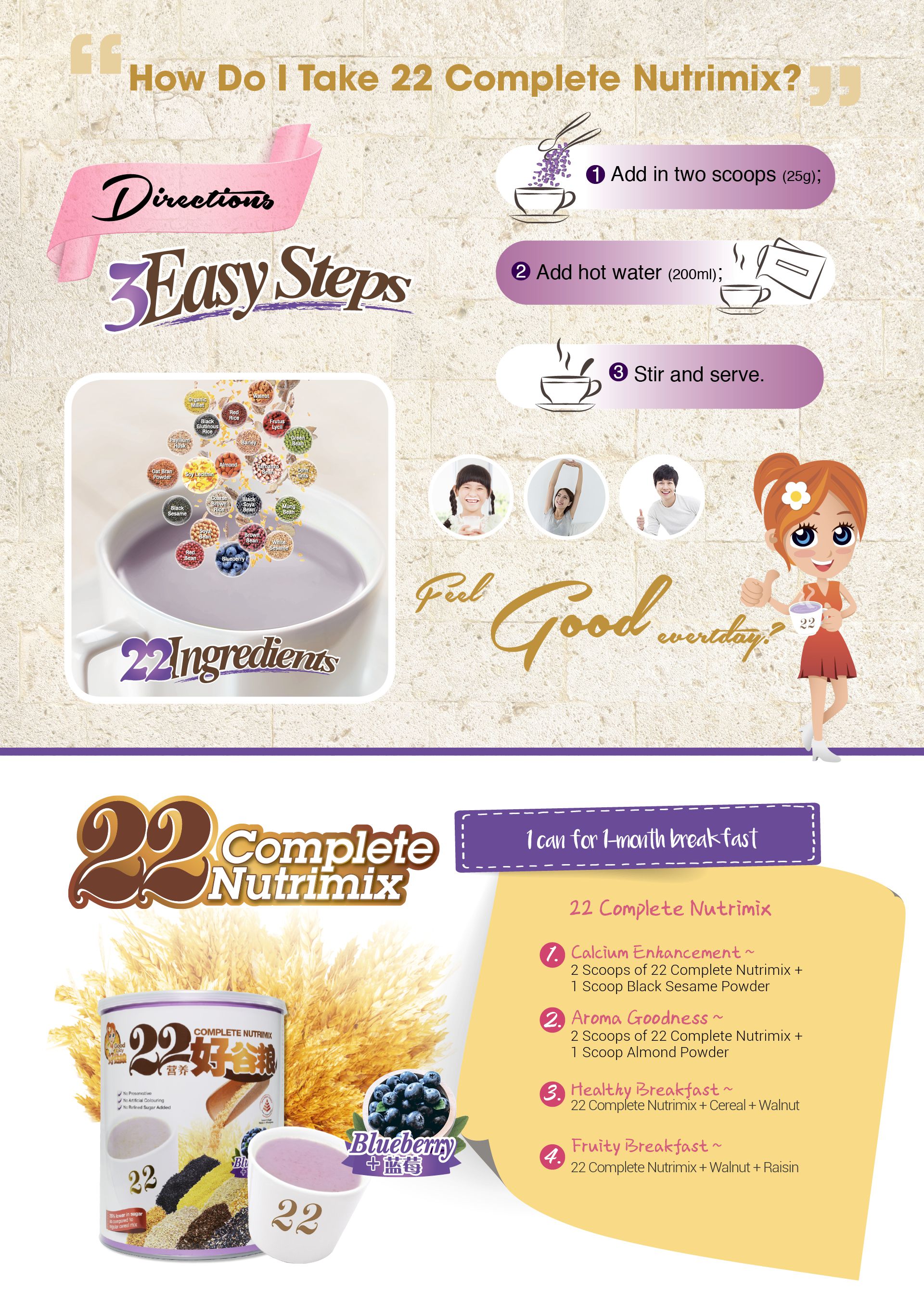 - Bột ngũ cốc dinh dưỡng Good Lady 22 Complete Nutrimix không bao gồm chất bảo quản và phẩm màu nhân tạo. Một khẩu phần của ngũ cốc Good Lady 22 Complete Nutrimix chứa 27% ngũ cốc nguyên hạt cung cấp cho bạn 13.5% nhu cầu ngũ cốc nguyên hạt hằng ngày.