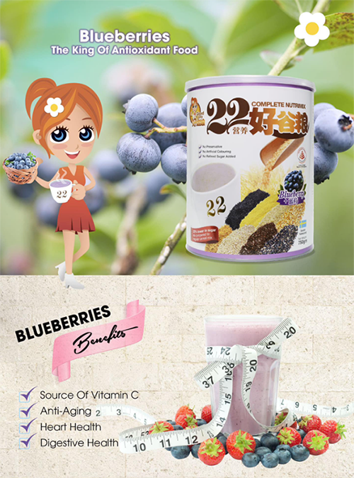 + Ngũ cốc 22+ Nutrimix - Blueberry giàu vitamin C, chống lão hóa, hỗ trợ tim mạch và cải thiện sức khỏe đường ruột.