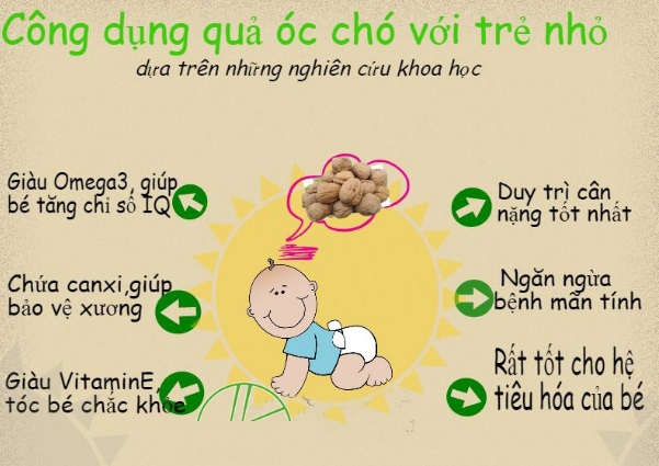 Sử dụng hạt óc chó sẽ cung cấp một lượng lớn omega 3 cho cơ thể, giúp trẻ thông minh hơn, trí não phát triển. Đồng thời, trẻ còn được bổ sung thêm một số thành phần thiết yếu, quan trọng như photpho, một số loại vitamin…