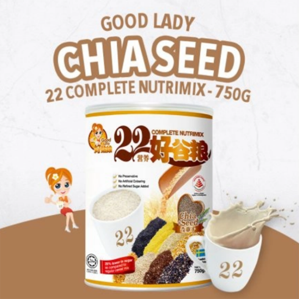 Bột ngũ cốc dinh dưỡng 22 Complete Nutrimix Chia Seed chỉ sử dụng fructose như chất làm ngọt và thêm vào hạt chia để cung cấp chất xơ. Lượng đường thấp hơn 25% so với ngũ cốc hỗn hợp thông thường khác.
