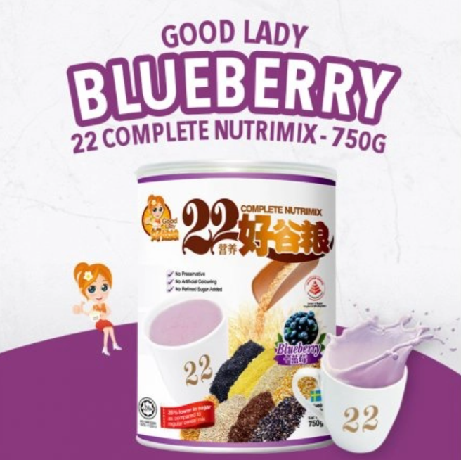 Bột ngũ cốc dinh dưỡng Good Lady 22 Complete Nutrimix chỉ sử dụng fructose như chất làm ngọt và thêm vào việt quất. Lượng đường thấp hơn 25% so với ngũ cốc hỗn hợp thông thường khác.