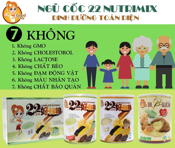 Bột ngũ cốc dinh dưỡng Good Lady 22 Nutrimix của Công ty Việt Hân chỉ sử dụng đường fructose như chất làm ngọt và thêm vào chiết xuất từ thiên nhiên khác như mầm lúa mì, hạt chia, việt quất, bơ. Ngoài ra, lượng đường thấp hơn 25% so với ngũ cốc thông thường khác, nên có vị thanh ngọt nhẹ dễ uống.