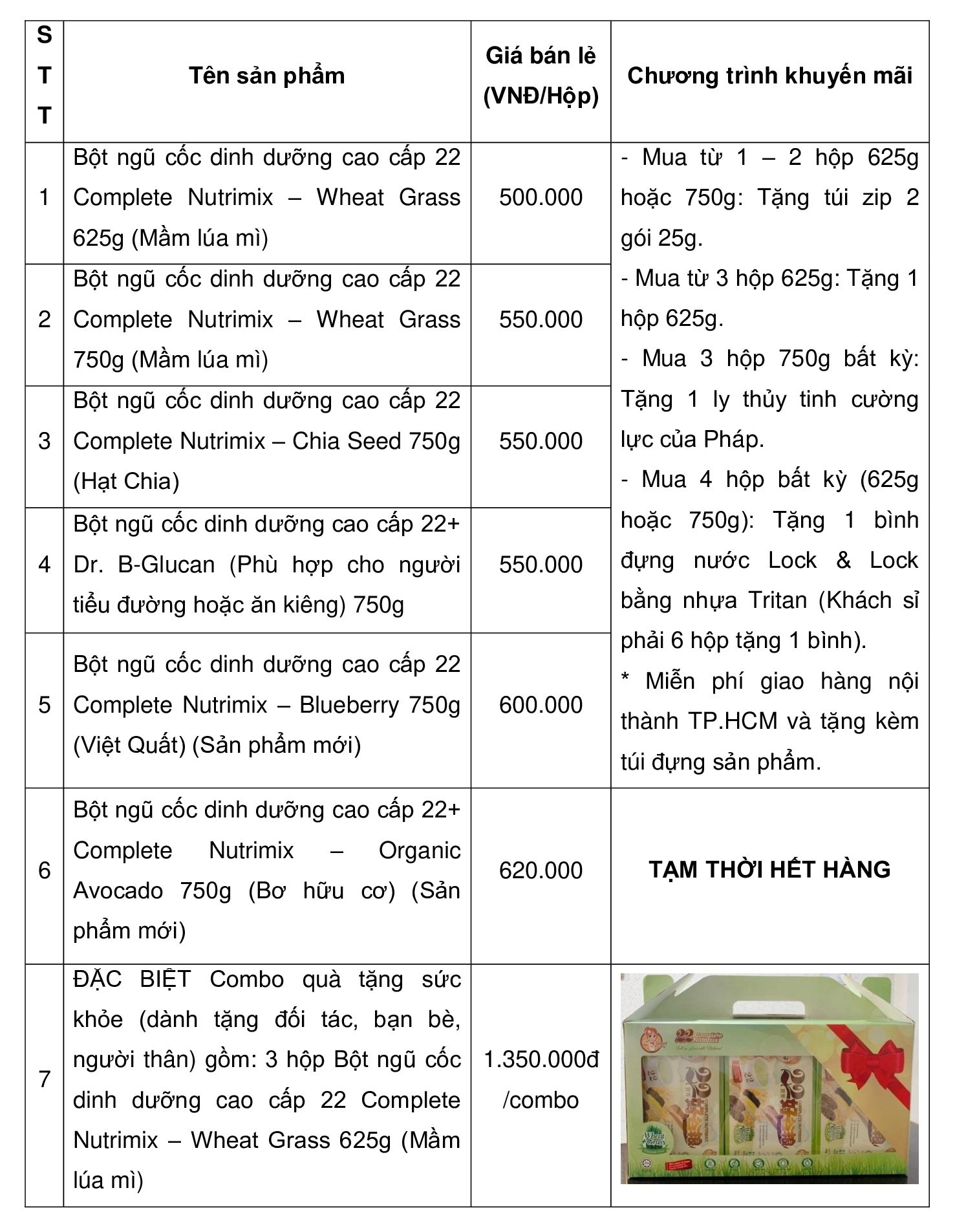 Từ ngày 19/4 - 2/5/2022 khi Quý khách hàng mua sản phẩm Bột ngũ cốc dinh dưỡng cao cấp 22 Nutrimix, sẽ được hưởng giá ưu đãi đặc biệt và nhận quà cực KHỦNG. Chi tiết sản phẩm áp dụng như sau: